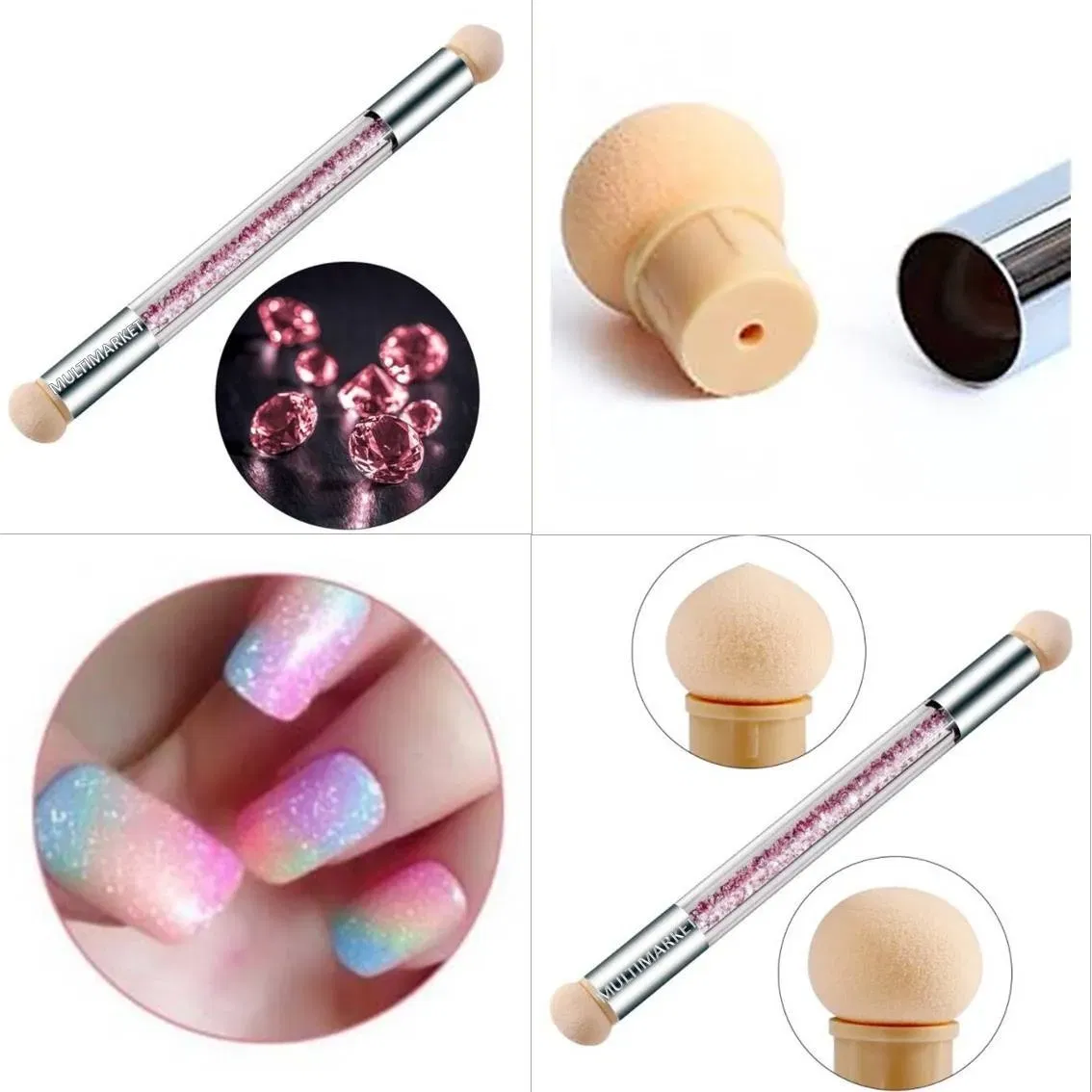 El pincel tiene una esponja en cada extremo: una redonda y otra en punta.