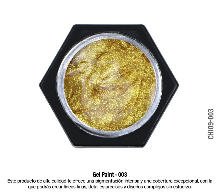 GEL PAINT COLOR DORADO, PARA REALIZAR DISEÑOS SIN TANTOS PASOS, OFRECE UNA PIGMENTACION INTENSA PARA TRAZOS FINOS Y CONCRETOS.